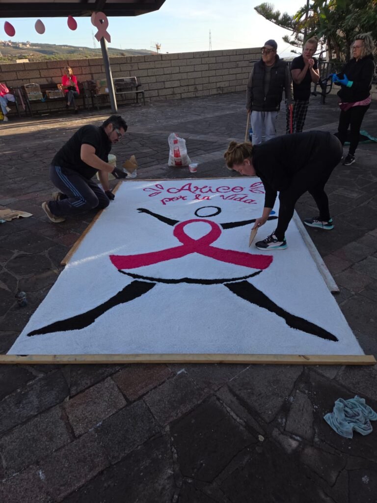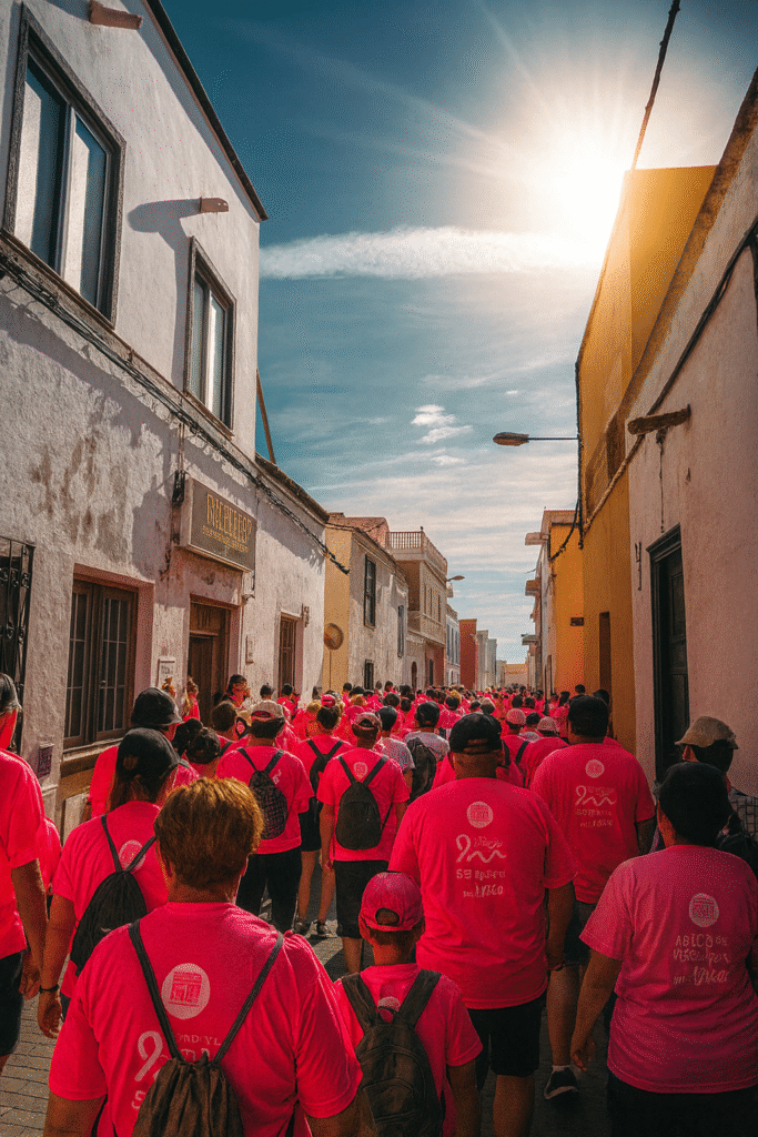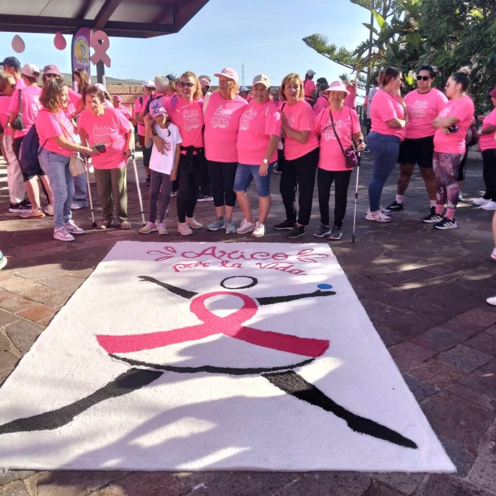 Amaneció con brisa fresca y cielo despejado en El Río de Arico, Tenerife, el sábado 15 de noviembre de 2025. Desde primera hora, un inusual bullicio llenaba este núcleo rural: las camisetas rosas de la caminata solidaria teñían de color la calle La Quinta, punto de partida del recorrido. A las 10:00, decenas de vecinos y vecinas —familias enteras, mayores, jóvenes y niños en cochecitos— se reunieron para “caminar, compartir y dar visibilidad a una causa que nos une”, como había invitado la Asociación de Mujeres de Abona. No era una competición, sino un paseo comunitario de tres kilómetros cargado de simbolismo: cada paso apoyaba la lucha contra el cáncer de mama y promovía salud, visibilidad y compromiso colectivo. Una preciosa alfombra emblemática y simbólica daba imagen a esa enfermedad que sacude a mujeres, pero también a hombres. El punto azul dedicha alfombra era por ellos.