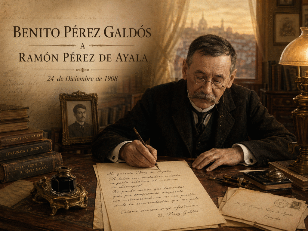 Esta carta de Benito Pérez Galdós a Ramón Pérez de Ayala, fechada el 24 de diciembre de 1908, es un testimonio significativo de las relaciones personales y profesionales que articulaban el mundo literario e intelectual de comienzos del siglo XX. En ella, Galdós manifiesta su sincero afecto y la alta estima que siente por Ayala, cuyo mérito reconoce sin reservas para desempeñar la plaza de profesor de lengua y literatura españolas en Liverpool. Sin embargo, se ve obligado a negarle la recomendación solicitada debido a un compromiso previo con Fernando de Arteaga, lo que pone de relieve un delicado conflicto entre amistad, justicia y lealtad personal. La carta muestra, además, el tono cordial y respetuoso propio del intercambio epistolar de la época, así como la humanidad de Galdós, que lamenta no poder ayudar más eficazmente a su joven corresponsal. La breve nota manuscrita final añade un matiz de inmediatez y cercanía, al dejar constancia de sus múltiples ocupaciones y de su deseo de mantener vivo el vínculo amistoso.