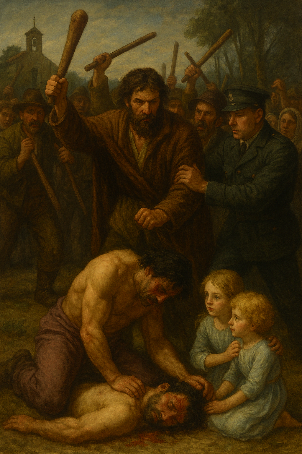 La masa actúa como una bestia ciega movida por el rumor. No hay juicio ni evidencia; basta una sospecha para desatar la tragedia.