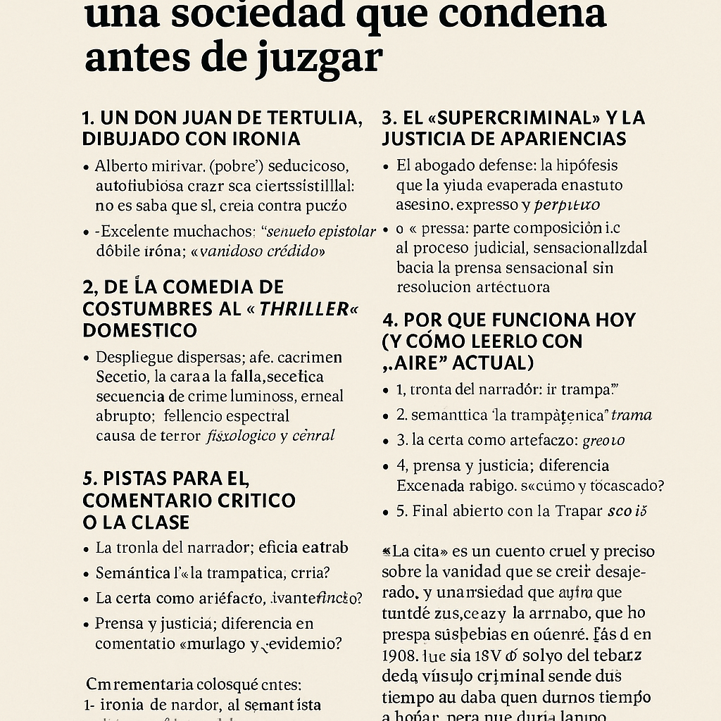 Este relato breve —publicado en La Ilustración Española y Americana en 1909— funciona como un mecanismo de relojería: presenta un “donjuán” de casino y café; lo conduce, paso a paso, hacia una situación de riesgo barnizada de perfume y ortografía “sin notables faltas”; y lo deja atrapado en una escena criminal donde todo lo incrimina salvo lo esencial: la verdad. A partir de ahí, el cuento despliega varias capas —sátira de costumbres, suspense urbano, crítica de la justicia y de la prensa— con una prosa irónica y precisa.