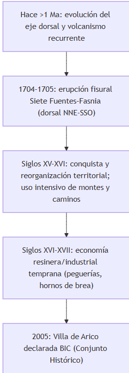 Los hitos volcánicos se apoyan en el IGME (erupción 1704–1705 y contexto de dorsal), mientras que los hitos patrimoniales se sustentan en el Boletín Oficial de Canarias para las declaraciones BIC (2005 y 2007). La ermita de El Río se documenta en actas de jornadas de historia local (escritura pública vecinal y licencia episcopal), y la campaña arqueológica de Camasverdes en comunicación institucional del Gobierno autonómico. La referencia a 2025 se formula como hecho reportado por prensa con acceso a expediente, no como documento publicado directamente en un boletín oficial.
