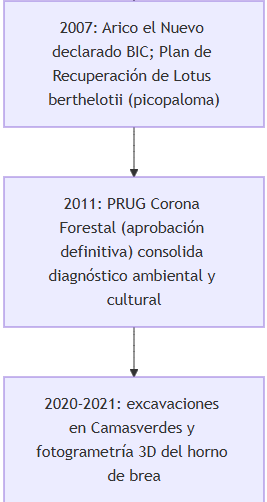 Una lectura “aplicada” de esta dinámica aparece en la planificación del Parque Natural de Corona Forestal: al describir unidades homogéneas, distingue explícitamente “pinar seco de Arico” y también una red de pistas cuyo eje principal es la “pista general de Arico”, conectando cumbres forestales con núcleos de medianías. Clima, accesos y usos aparecen así amarrados en un mismo documento técnico: el microclima influye en la vegetación; la vegetación y el relieve condicionan pistas; y esas pistas, a su vez, canalizan el uso público y los riesgos.