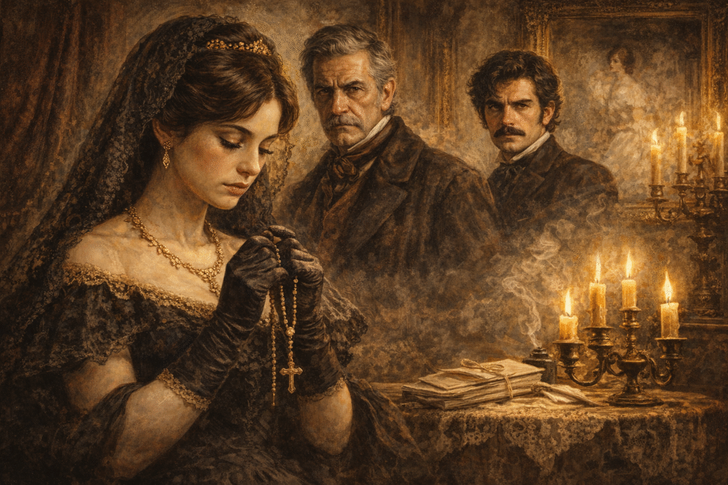 Cuenta doña Nicanora que al abrir la puerta de la sala les vio sentaditos el uno junto al otro, las caras bastante aproximadas, ella susurrando, él atendiendo con sus cinco sentidos, como los curas en el confesionario. […] Bien quería ella pescar algo de lo que la penitente decía; pero hablaba tan quedito, que ni una palabra llegó a las anhelantes orejas de la señora de Ido.[41]