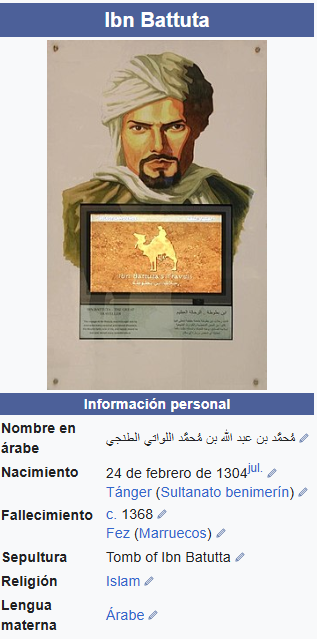 Ibn Battuta (1304-1368/69) fue un viajero, geógrafo y escritor marroquí, célebre por haber realizado el periplo más extenso de la Edad Media y plasmarlo en una crónica conocida como su Rihla (relato de viaje). Nacido en Tánger durante el Sultanato benimerín, dedicó casi treinta años de su vida a recorrer los territorios del mundo conocido de su época –desde el norte de África y al-Ándalus hasta Oriente Medio, India, Asia Central, el sureste asiático y China– superando en distancia y duración los viajes de su contemporáneo Marco Polo. Su relato de viajes, dictado a su regreso en 1354 al erudito andalusí Ibn Juzayy por encargo del sultán de Fez, se ha convertido en una obra clásica de la literatura árabe y una fuente histórica fundamental para el estudio de la época medieval islámica.
