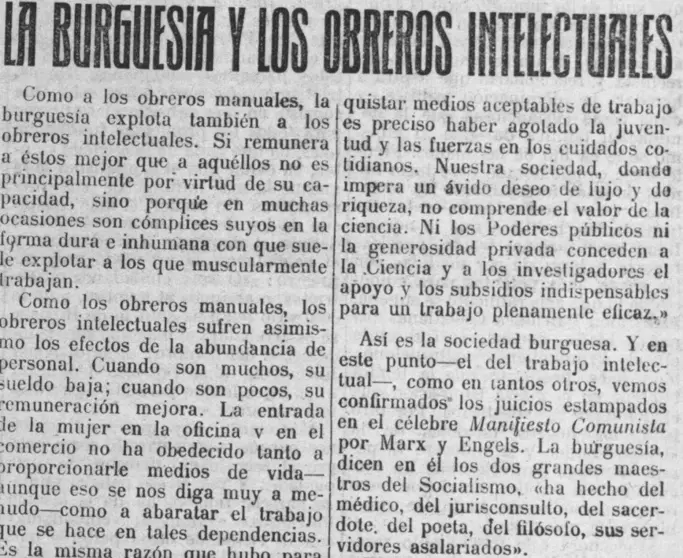 Por eso, era normal que los intelectuales sintiesen inclinación por el socialismo. Era lógico que, como los trabajadores manuales, intentaran librarse de esta explotación. Lo raro sería lo contrario, una forma, a nuestro entender, de intentar concienciar a esos intelectuales que colaboraban con la burguesía que los explotaba, como explicó al principio.