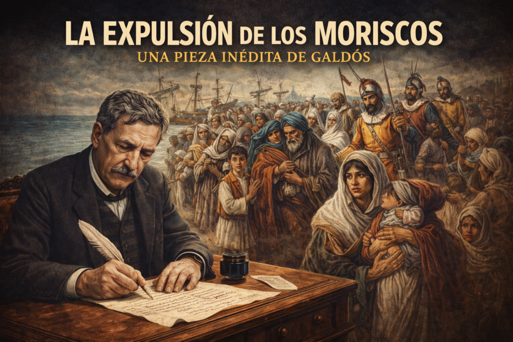 «La expulsión de los moriscos» es un drama histórico escrito por Galdós hacia 1864-1865, que recreaba precisamente aquel hecho histórico del siglo XVII. Desafortunadamente no se conserva el texto completo de la obra – se considera una obra “perdida” – por lo que el argumento solo puede inferirse de su título y contexto. Sabemos por los biógrafos que Galdós entregó el manuscrito en 1864 al empresario Manuel Catalina, director del Teatro del Príncipe de Madrid, esperando su estreno. Sin embargo, nunca llegó a representarse en escena, ni a publicarse en vida del autor.