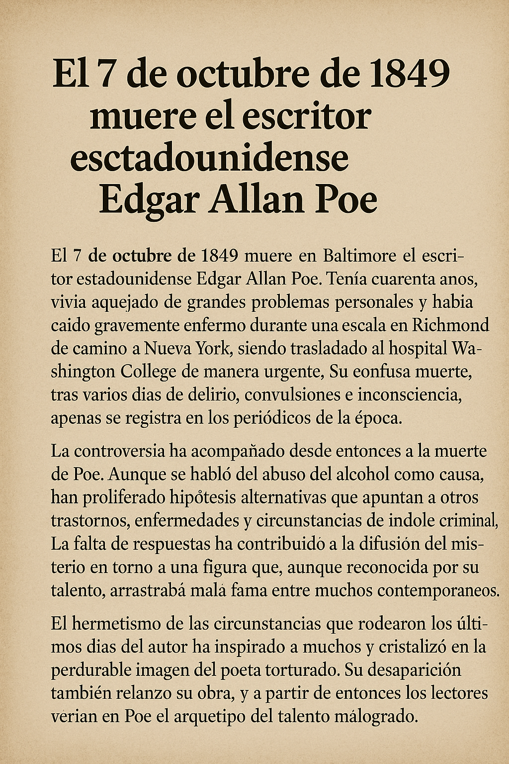 Edgar Allan Poe murió en circunstancias enigmáticas que han generado una serie de teorías, desde el abuso de alcohol hasta el asesinato. El hallazgo de un hombre desaliñado y delirante en una taberna de Baltimore, su breve hospitalización y el diagnóstico vago de “congestión del cerebro” alimentaron el misterio. El obituario difamatorio de Rufus Griswold marcó la percepción pública inicial, pero los defensores de Poe rescataron su figura y destacaron su genio literario. La combinación de una vida turbulenta, una muerte inexplicada y una obra que exploró los límites de la mente humana convirtió a Poe en un mito cultural cuya sombra se proyecta hasta nuestros días.