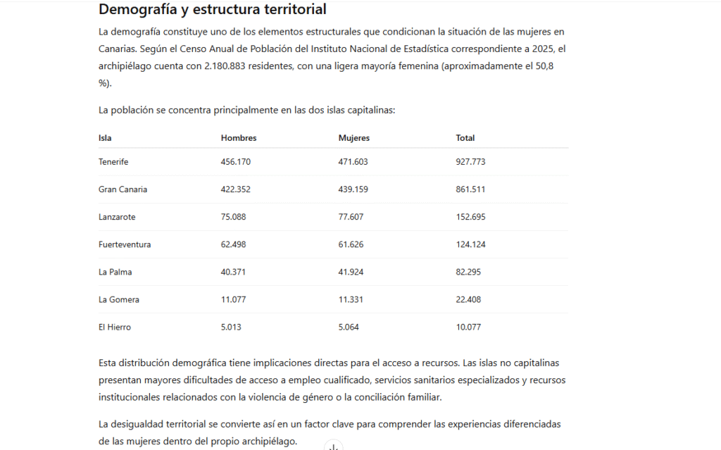 Estas cifras demográficas no son neutras desde el punto de vista social. La concentración de población determina también la concentración de servicios sanitarios, centros educativos, empleo cualificado y recursos institucionales de protección social. En consecuencia, la experiencia cotidiana de las mujeres puede variar significativamente entre islas capitalinas y no capitalinas. La insularidad no es solo una condición geográfica; se convierte en un factor estructural de desigualdad.