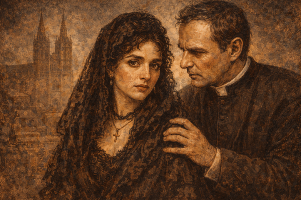 Clarín enfatiza la dualidad corporal y espiritual de Don Fermín a través de descripciones significativas. Por ejemplo, se nos cuenta que el Magistral es alto, fuerte y velludo, dotado de una musculatura “hercúlea” poco usual en un clérigo. En una escena reveladora, Fermín se contempla semidesnudo frente al espejo: “miraba con tristeza sus músculos de acero, de una fuerza inútil… el mozo fuerte y velludo que tenía enfrente […] le parecía un otro yo que se había perdido”. Acto seguido, al abrocharse el alzacuello clerical, “el Magistral volvió a ser la imagen de la mansedumbre cristiana”. Esta imagen del espejo sintetiza al personaje: su identidad oscila entre dos yos, el hombre viril con anhelos humanos y el sacerdote sometido a una máscara de humildad. Cada mañana, al ceñirse la soga clerical al cuello, Fermín vuelve a reprimir al “otro yo” bajo la apariencia beatífica que la sociedad espera de él. Pero esa represión no elimina sus deseos; solo los oculta, generando una tensión interna cada vez más insostenible.