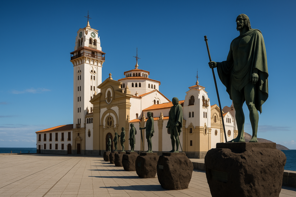 Estatuas de los Menceyes Guanches en la Plaza de la Patrona de Canarias (Villa de Candelaria, Tenerife), frente a la basílica de la Virgen. Este conjunto escultórico monumental honra la memoria de los nueve reyes aborígenes de Tenerife, subrayando su vínculo histórico con la Virgen de Candelaria. La presencia de estas estatuas y la propia inclusión de dos figuras guanches adorando a la Virgen en el escudo municipal de Candelaria evidencian cómo la devoción integra la identidad guanche en la cultura canaria actual.