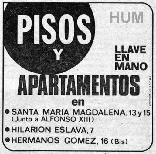 En 1978 aparecían los primeros anuncios de venta de inmuebles en Hilarión Eslava, 7. Se trataba de lujosos pisos de 4 habitaciones y terraza, con ascensor, plaza de garaje, calefacción y agua caliente central. Los apartamentos, de un dormitorio, disponían de los mismos servicios.