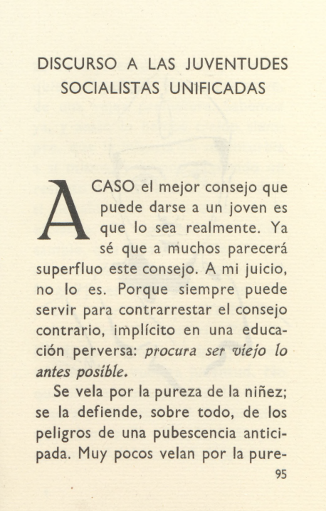 Yo os saludo, pues, jóvenes socialistas unificados, con un respeto que no siempre pude sentir por los ancianos de mi tiempo, porque muchos de ellos estaban deshaciendo a España, y vosotros pretendéis hacerla. Desde un punto de vista teórico, no soy marxista, no lo he sido nunca, es muy posible que no lo sea jamás. Mi pensamiento no ha seguido la ruta que desciende de Hegel a Carlos Marx. Tal vez porque soy demasiado romántico, por el influjo —acaso— de una educación demasiado idealista, me falta simpatía por la idea central del marxismo; me resisto a creer que el factor económico —cuya enorme importancia no desconozco— sea el más esencial de la vida humana y el gran motor de la historia. Veo, sin embargo, con entera claridad, que el Socialismo, en cuanto supone una manera de convivencia humana basada en el trabajo, en la igualdad de medios concedidos a todos para realizarlo, y en la abolición de los privilegios de clase, es una etapa inexcusable en el camino de la justicia; veo claramente que es la gran experiencia humana de nuestros días, a la que todos de algún modo debemos contribuir. Ella coincide plenamente con vuestra juventud, y es una tarea magnífica, no lo dudéis. De modo que, no sólo por jóvenes verdaderos, sino también por socialistas, os saludo con entera cordialidad. Y en cuanto habéis sabido unificaros —que es mucho más que uniros, o juntaros para hacer ruido—, contáis con toda mi simpatía y con mi más sincera admiración.