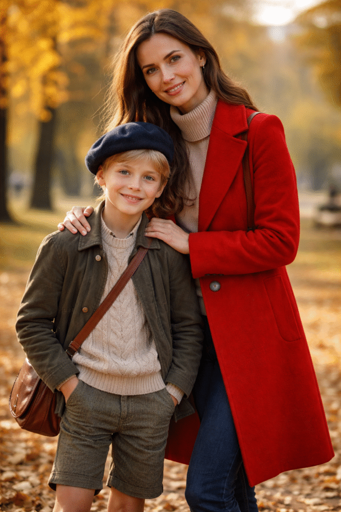 C’est un jour de brouillard, les parcs sont vides et il n’y a personne dans les rues. C’est en Europe mais cela pourrait se passer dans n’importe quel pays. Il est quatre heures de l’après-midi. La pire heure du jour. Une mère (35 ans) et son enfant (12 ans) se promènent solitaires. Il fait froid, tout est gris. Les immeubles, l’air, l’oxygène. L’enfant est habillé comme un ancien, un long manteau, une chemise à rayures grises, un gilet, des pantalons à carreaux, des bottines de cuir marron. Ses cheveux blonds apparaissent sous une casquette de velours bouffante. La mère porte un béret de couleur rouge avec une tresse blonde, un manteau rouge au col et aux boutons noirs, des collants rayés et des chaussures plates vernies. Elle est calme et heureuse.