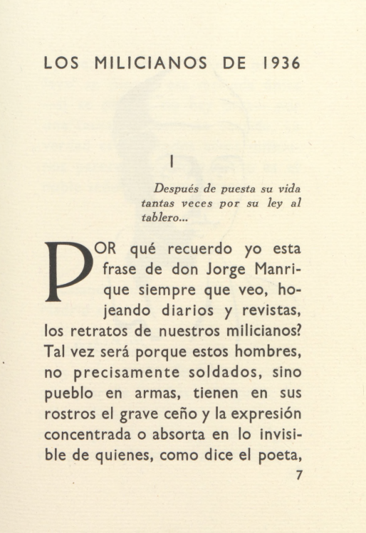 Después de puesta su vida tantas veces por su ley al tablero… ¿Por qué recuerdo yo esta frase de don Jorge Manrique siempre que veo, hojeando diarios y revistas, los retratos de nuestros milicianos?